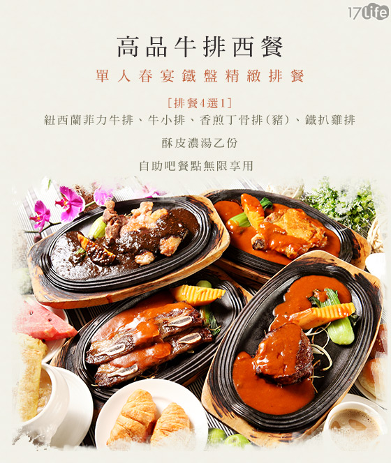 聚餐時刻又到了, 17Life-吃喝玩樂團購3折起,又讓愛聚餐的我們買不停吃不停,價格超殺,如果點進去已經售完別捶心肝喔!限時限量的團購券先搶先贏喔! 高品牛排西餐-單人春宴鐵盤精緻排餐